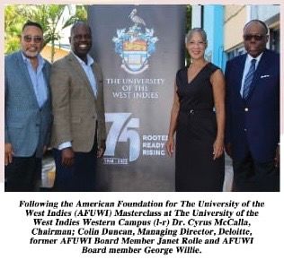 The AFUWI's fundraising events, including black-tie awards gala in New York, annually provide funds for scholarships to the UW in various disciplines to students across The UWI's landed and virtual campuses. Proceeding the golf tournament, Dr. McCalla George Willie, Vice Chairman. Janet Rolle, former CEO of the American Ballet Theatre and honorary UWI Mona graduand and Colin Duncan, Managing Director of Deloitte, participated in the "Masterclass" at the UWI Western Jamaica campus where the student body enthusiastically received them.